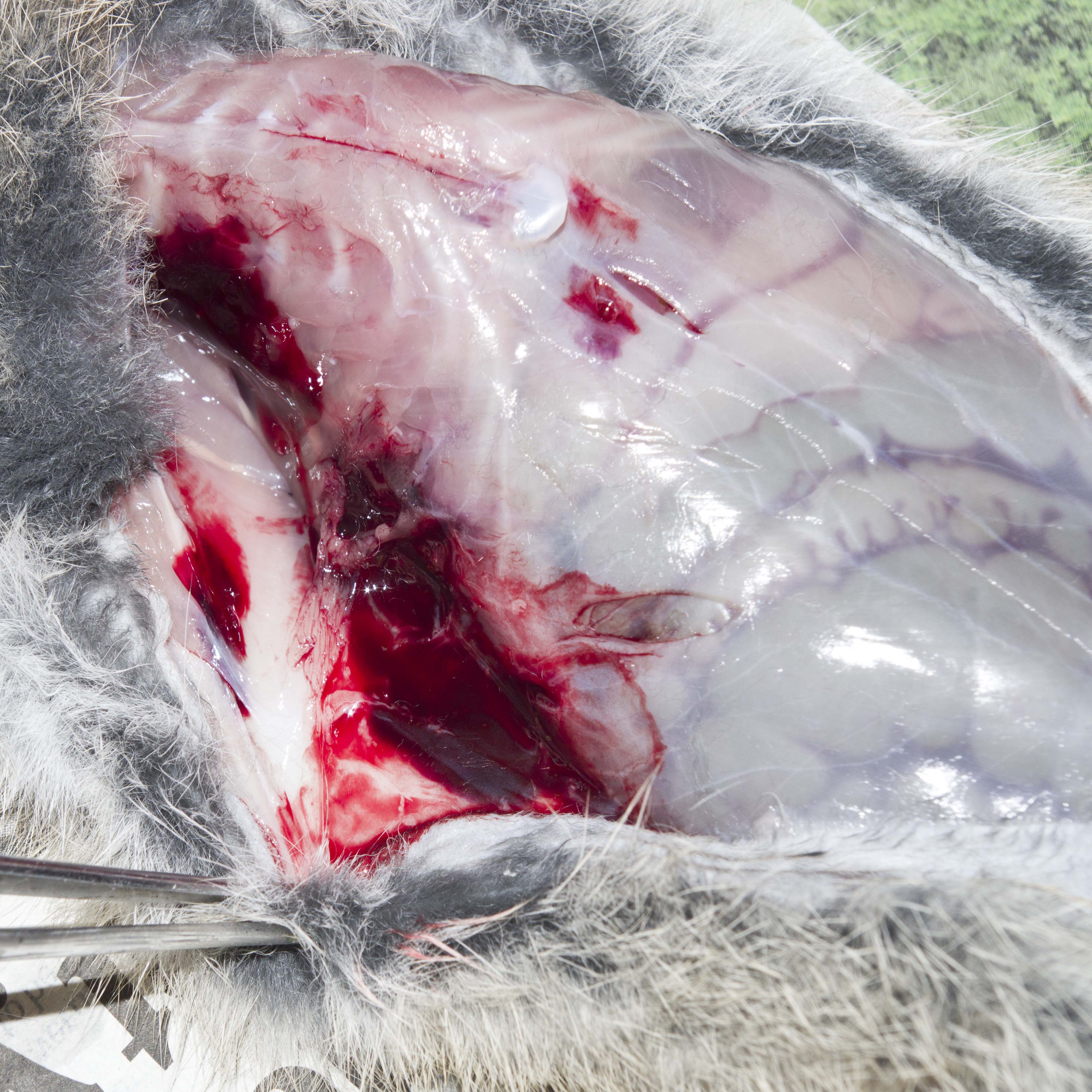 This juvenile wild rabbit was found after a Common Buzzard was disturbed and flew into a tree that was close by. The body was warm and limp indicating that the rabbit had only just died. There were no visible marks or wounds on the body. After the skin was partially removed, four small tears were found that penetrated either the thorax or abdomen. One of these had caused substantial haemorrhage. These marks were consistent with wounds inflicted by talons. There was more severe damage internally.