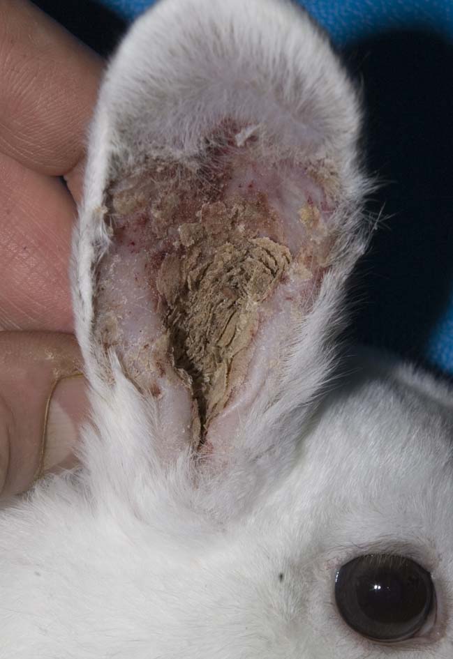 This photo shows the typical appearance of a rabbit's ear that is infested with ear mites (Psoroptes cuniculi). Microscopically the flakes of debris are full of motes. They can just be seen with the naked eye. The ear is very itchy and sore. Affected rabbits shake their heads repetitively.
