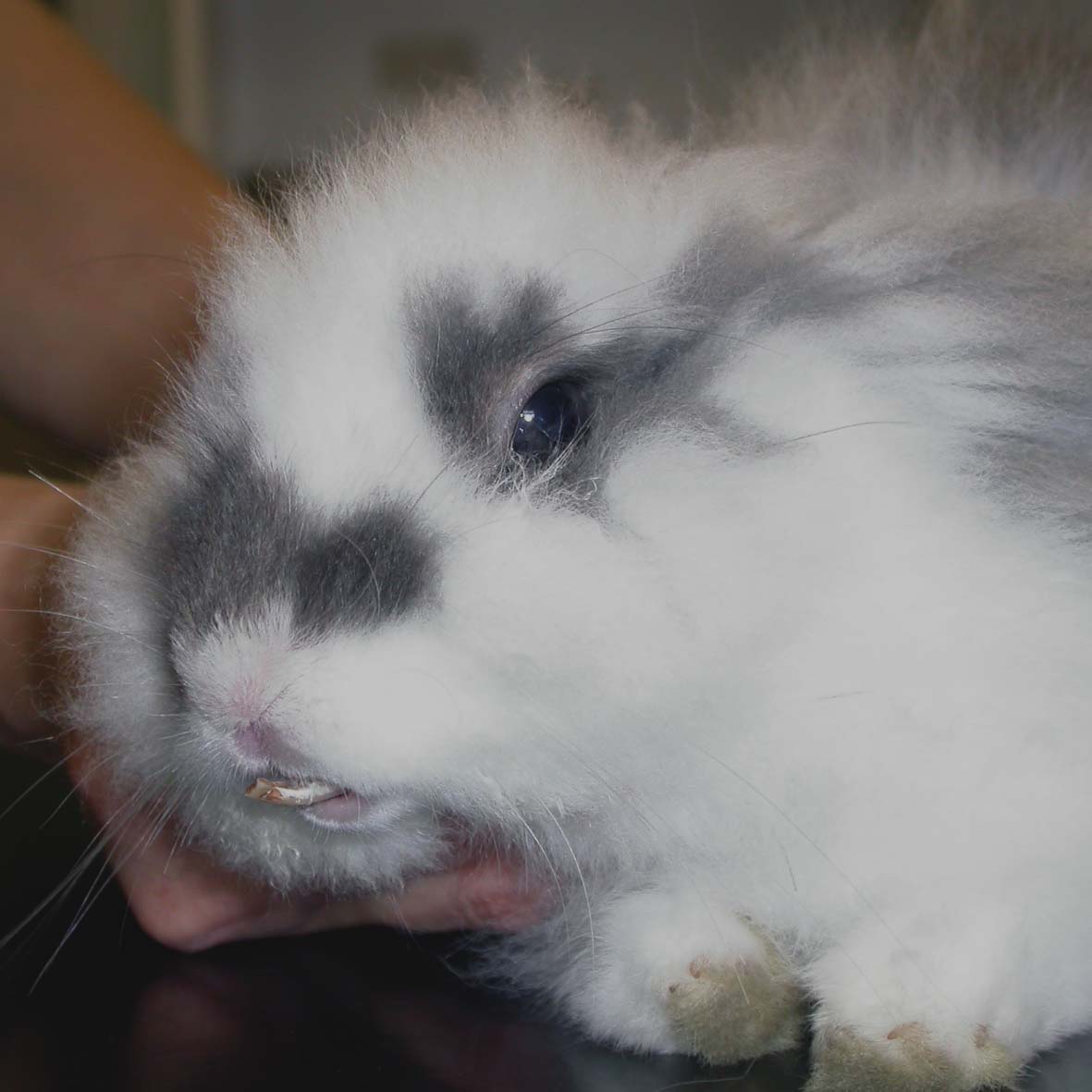 This rabbit has congenital incisor malocclusion. The upper and lower incisors will never meet or be functional. He also has a big fluffy coat that would be a problem for him to groom, even if his incisors were normal. Rabbits use their incisors like pincers to grasp dead hair and remove it from the fur. The rabbit also has spotted markings, which is linked with 'megacolon' syndrome although only a small proportion of them develop it. This rabbit is going to take a lot of care. and commitment to keep the area under his tail free from urine and uneaten caecotrophs. He will need regular grooming and trimming.