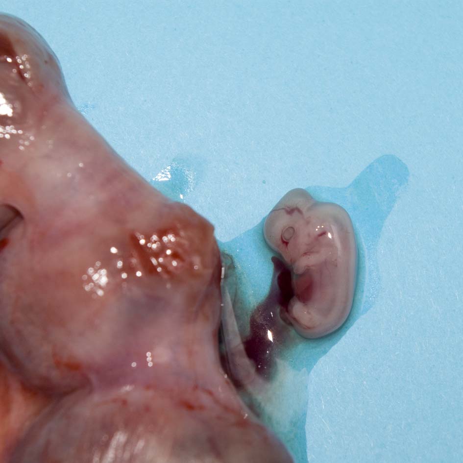 This embryo was inside a swelling in the uterus that was removed during routine ovariohysterectomy. Other swellings contained resorbing foetuses.